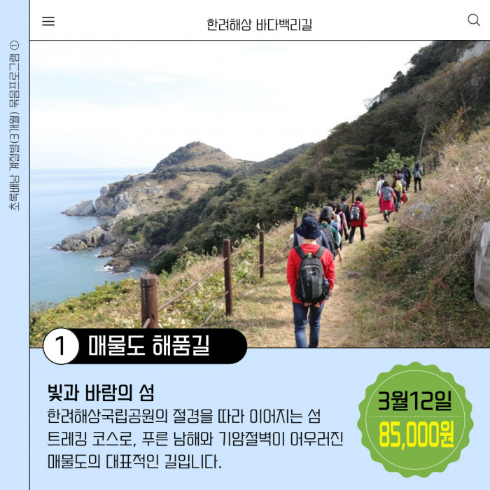 3/12 매물도 해품길, 4/9 비진도 산호길, 5/14 하화도 꽃섬길 (묶음상품으로 결제시 10%할인)